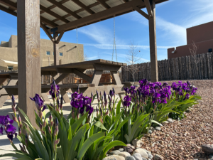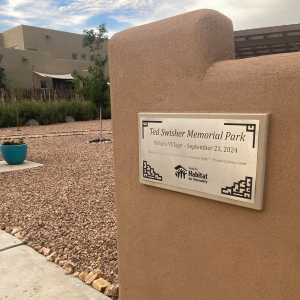 Santa Fe Habitat for Humanity generously built and created the latest open space addition to Oshara Village, The Ted Swisher Memorial Park on Blue Feather. The pocket park features two raised shade structures with bench swings, picnic tables, ADA accessible pathway and parking curbside. The park was completed fall 2024.