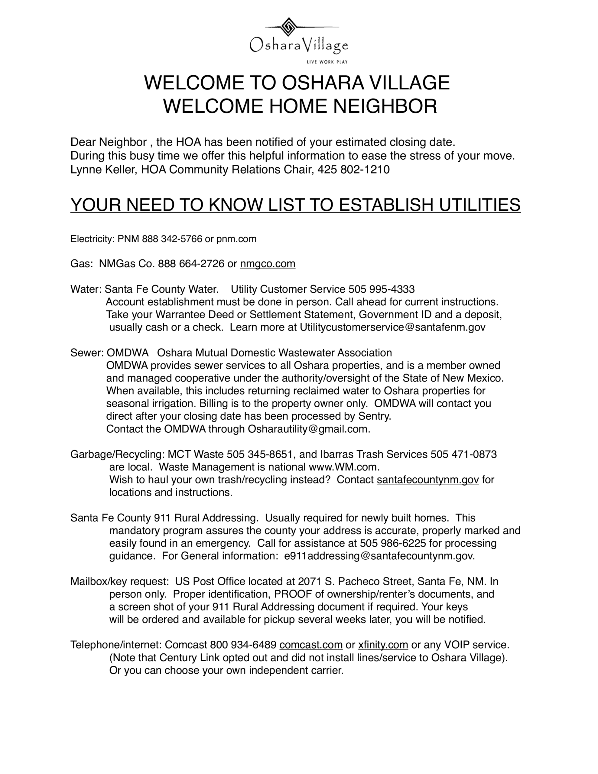 Mailbox/key request: US Post Office located at 2071 S. Pacheco Street, Santa Fe, NM. In person only. Proper identification, PROOF of ownership/renter’s documents, and a screen shot of your 911 Rural Addressing document if required. Your keys will be ordered and available for pickup several weeks later, you will be notified.
